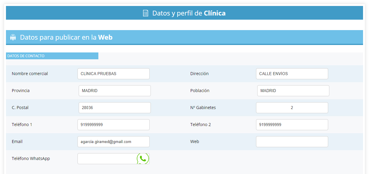 En este apartado debe completar la información de la clínica que posteriormente verán los pacientes.