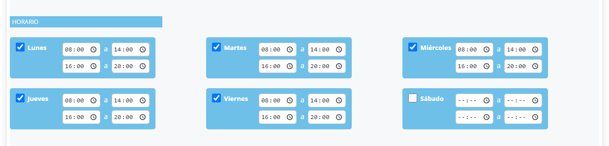 Para ello debe marcar el check en el día y luego pinchar en el reloj de la izquierda de cada hora, se abrirá un desplegable y podrá escoger la hora.