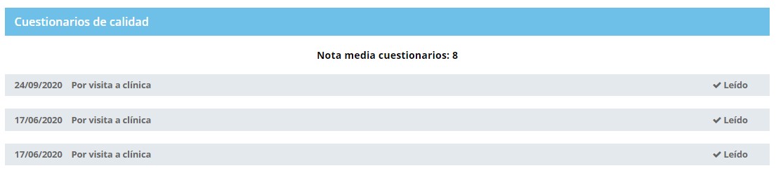 Por ello y para que su clínica tenga conocimiento de la misma información de que disponen las aseguradoras, puede ver el resultado de las encuestas de calidad remitidas a sus pacientes en el botón de "Ver cuestionarios de calidad de sus pacientes".