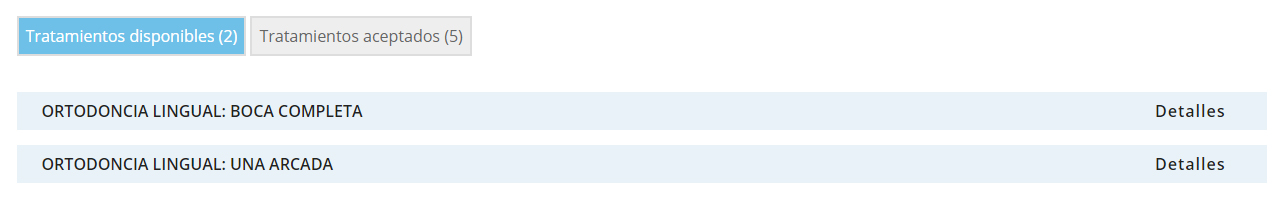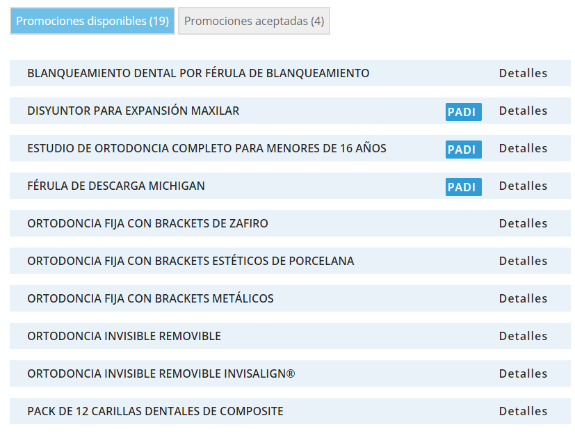 A través del botón "Detalles", puede ver el contenido de cada tratamiento. Se ha diferenciado entre aquellos que permiten que cada clínica fije un precio (entre el mínimo y el máximo establecido) y aquellos que, por sus características, requieren de una valoración previa del paciente para su correcto diagnóstico y emisión de presupuesto.