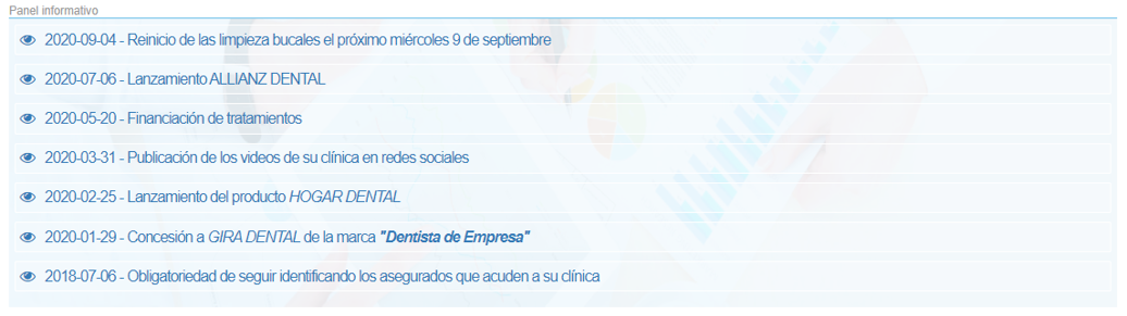 Lo primero que vemos es un panel en el que se nos muestran las diferentes comunicaciones que se han enviado y que resultan de interés para la clínica.