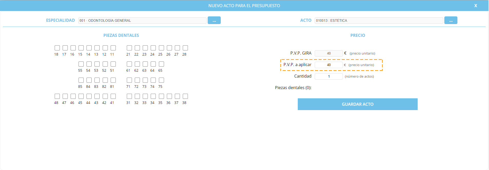 A continuación, nos pedirá que indiquemos el número de piezas dentales (en el caso de ser necesario).